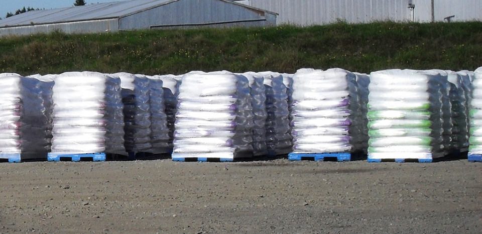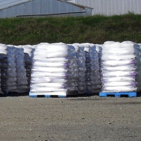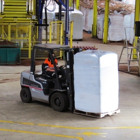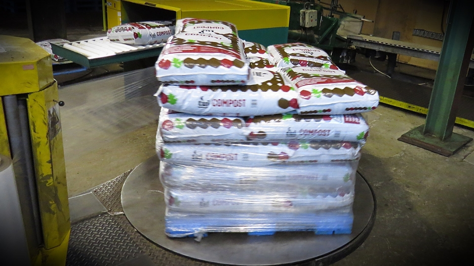 4.5m3 bales of compressed peat, wrapped and on a pallet for easy distribution.